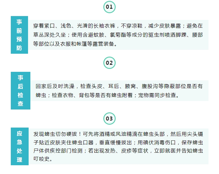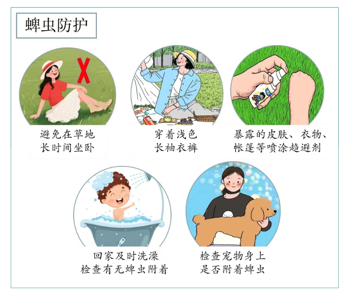 蜱蟲叮咬多發(fā)生于春夏季(4-10月),因南方濕熱的氣候,蜱蟲活躍期相對(duì)比北方更長(zhǎng)。市民享受美妙的草坪時(shí)光的同時(shí),建議采取以下防護(hù)措施: